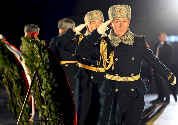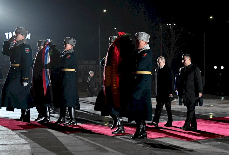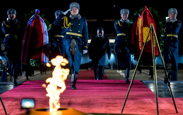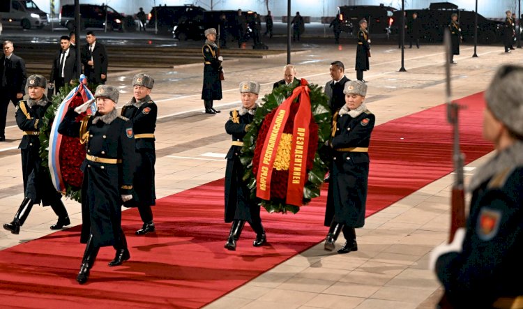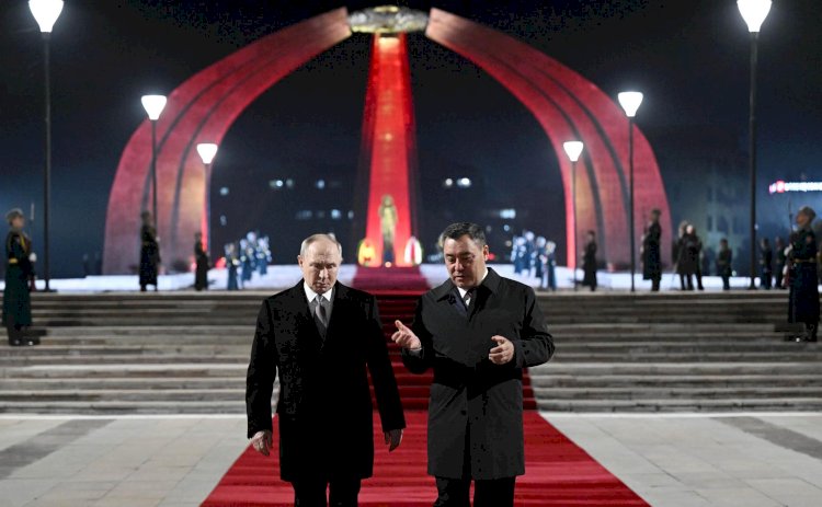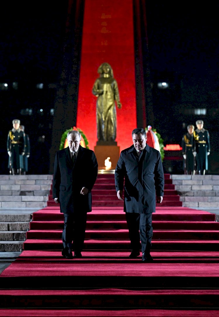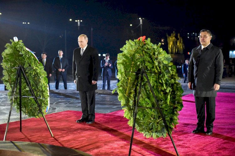 Президенттер Садыр Жапаров жана Владимир Путин Бишкекте Жеңиш аянтындагы Өчпөс отко гүлчамбар коюшту